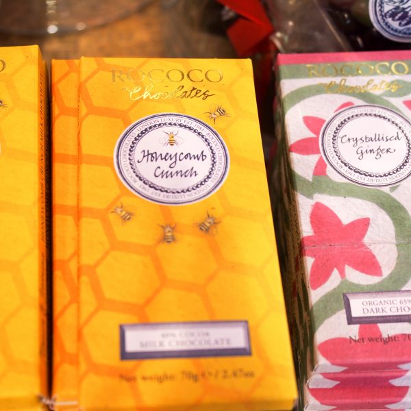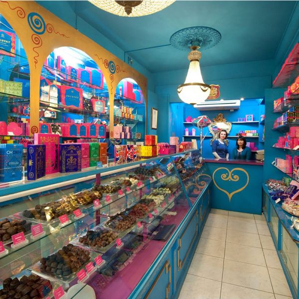 המקום והמתוקים: החנות נראית כלקוחה מפנטסיית ילדים מתוקה – עם קירות צבעוניים, קשתות מאוריות וויטרינה שופעת שוקולדים. גם עיצוב הקופסאות עדיין נושא גרפיקה רומנטית מסולסלת, אך הטעמים מתכתבים עם המאה ה־20: טראפלס שוקולד לבן במילוי ג'ין, שוקולד רובי ורוד במילוי קרמל מלח ים ומיני טראפלס במילוי שמפניה ורודה. מומלץ לשים לב ל־THINS – עיגולי שוקולד דקיקים ושטוחים שנמסים בפה במתיקות נפלאה.
